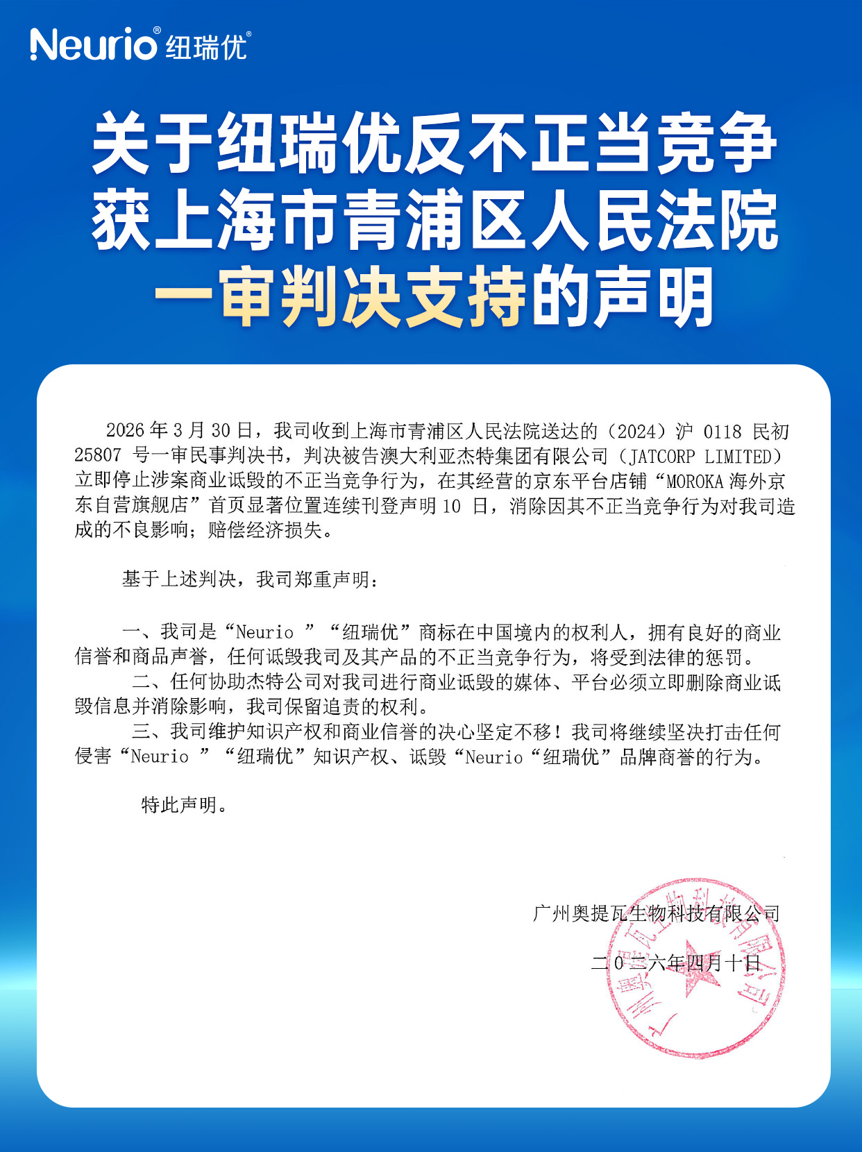 关于纽瑞优反不正当竞争获上海市青浦区人民法院一审判决支持的声明